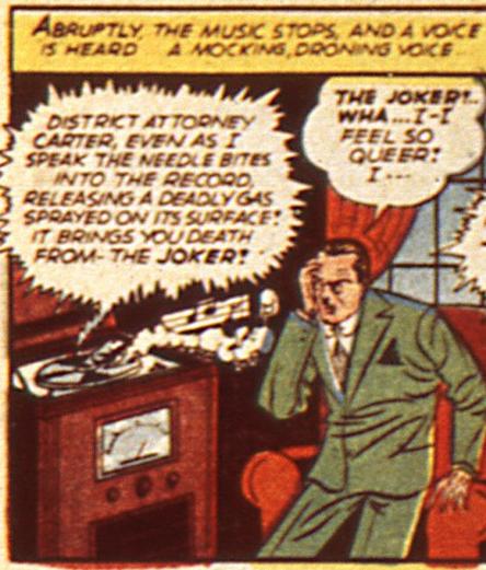 Heh, nice updated reference to the classic Golden Age story where the Joker sent his victims LPs that would release Joker Venom when touched by the record player needle! That said, I gotta rant about something that's been ticking me off: what the hell is up with the tendency over the past few years to depict Joker Venom victims as getting white skin, green hair, and red lips when they die?